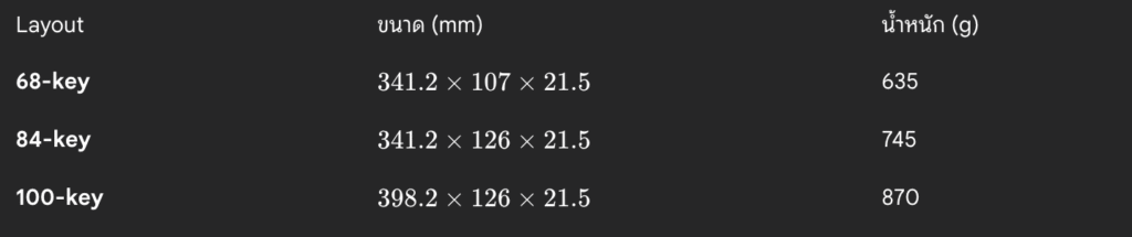 • 84-key & 100-key: 3000mAh (เพิ่มขึ้น 50% จากรุ่นแรกที่มี 2000mAh)